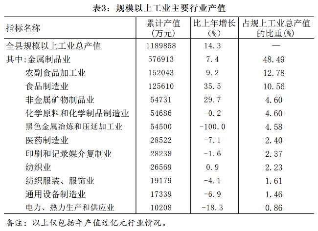 2023年全縣85家規(guī)模以上工業(yè)企業(yè)完成工業(yè)總產(chǎn)值118.99億元,同比增長14.3%。完成規(guī)上農(nóng)產(chǎn)品加工產(chǎn)值32.68億元,同比增長15.6%。分主要行業(yè)看,金屬制品業(yè)、農(nóng)副食品加工業(yè)、食品制造業(yè)分別完成產(chǎn)值57.69億元、15.20億元、12.56億元,同比增長7.4%、9.2%、35.5%,占全縣規(guī)上工業(yè)總產(chǎn)值71.8%。