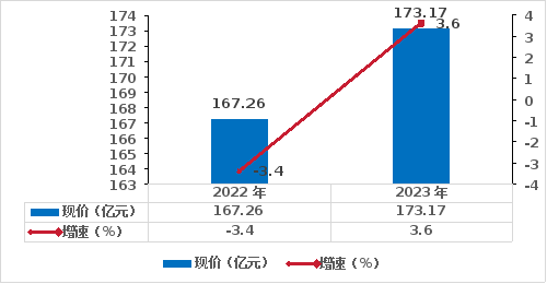 根據(jù)縣(市)生產(chǎn)總值統(tǒng)一核算結(jié)果,2023年全縣生產(chǎn)總值173.17億元,比上年同期增長3.6%,兩年平均增長0.04%。其中,第一產(chǎn)業(yè)增加值35.73億元,比上年同期增長4.3%,兩年平均增長4.20%;第二產(chǎn)業(yè)增加值68.61億元,比上年同期增長1.2%,兩年平均下降4.35%;第三產(chǎn)業(yè)增加值68.83億元,比上年同期增長5.6%,兩年平均增長2.45%。