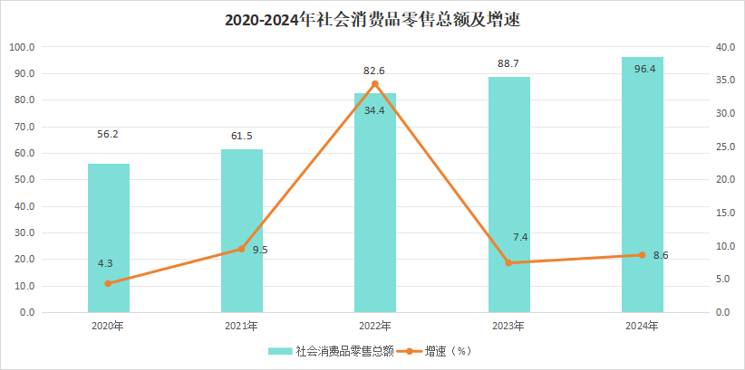 全年社會消費品零售總額96.4億元,同比增長8.6%。全年限額以上單位商品零售額中,糧油、食品類同比增長14%;服裝鞋帽、針、紡織品類同比增長57.4%;日用品類同比增長33%;家用電器和音像器材類同比增長2990.9%;汽車類同比增長132.9%,其中,新能源汽車同比增長137.7%。2024年鄂爾多斯市康巴什區(qū)人民政府國民經(jīng)濟和社會發(fā)展統(tǒng)計公報(2025年更新)
