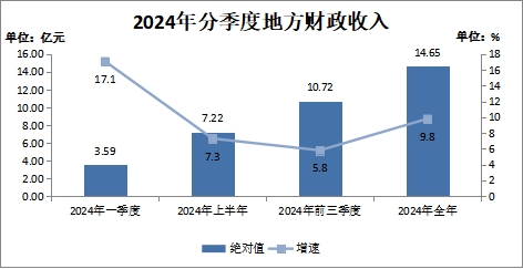 全年地方財政收入14.65億元,同比增長9.8%。其中,稅收收入11.94億元,同比增長17.6%;非稅收入2.71億元,同比下降14.9%。地方財政支出55.69億元,同比增長13.9%。