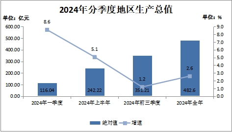 初步核算,2024年實現(xiàn)生產(chǎn)總值(GDP)482.60億元,同比增長2.6%。其中,第一產(chǎn)業(yè)增加值完成27.10億元,同比增長4.4%;第二產(chǎn)業(yè)增加值完成157.36億元,同比增長0.1%;第三產(chǎn)業(yè)完成298.14億元,同比增長3.7%。