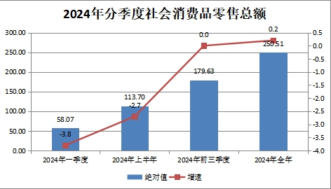 全年社會消費品零售總額完成250.51億元,同比增長0.2%;限額以上社會消費品零售總額完成142.49億元,與去年同期持平。