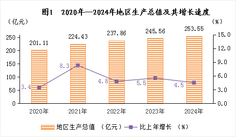 全年地區(qū)生產(chǎn)總值253.55億元,按可比價(jià)比上年增長(zhǎng)4.5%。其中,第一產(chǎn)業(yè)增加值39.91億元,增長(zhǎng)2.6%;第二產(chǎn)業(yè)增加值75.44億元,增長(zhǎng)8.2%;第三產(chǎn)業(yè)增加值138.2億元,增長(zhǎng)3%。三次產(chǎn)業(yè)結(jié)構(gòu)為15.7:29.8:54.5,三次產(chǎn)業(yè)對(duì)GDP增長(zhǎng)的貢獻(xiàn)率分別為10.1%、54.3%、35.6%。非公有制經(jīng)濟(jì)增加值145.7億元,增長(zhǎng)6.2%。