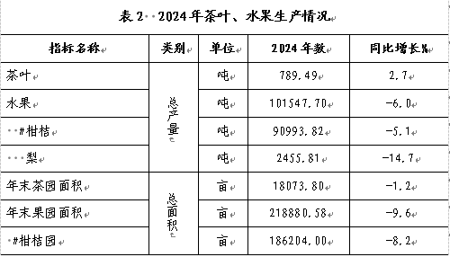 全年糧食總產(chǎn)量28.11萬(wàn)噸,比上年增產(chǎn)3.4%。油料產(chǎn)量1.37萬(wàn)噸,增產(chǎn)18.5%。其中油菜籽3878.8噸,增產(chǎn)21.7%。蔬菜產(chǎn)量49.98萬(wàn)噸,增產(chǎn)3.4%。煙葉產(chǎn)量1508.85噸,減產(chǎn)16.4%。茶葉產(chǎn)量789.49噸,增產(chǎn)2.7%。水果產(chǎn)量10.15萬(wàn)噸,減產(chǎn)6.0%。其中臍橙產(chǎn)量8.81萬(wàn)噸,減產(chǎn)5.5%。