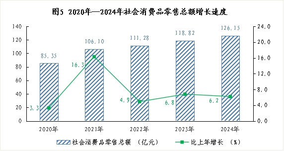 全年社會(huì)消費(fèi)品零售總額126.15億元,比上年增長(zhǎng)6.2%。其中限額以上單位消費(fèi)品零售額43.39億元,增長(zhǎng)16.9%。按經(jīng)營(yíng)地分,城鎮(zhèn)消費(fèi)品零售額32.34億元,增長(zhǎng)14%;鄉(xiāng)村消費(fèi)品零售額1.37億元,增長(zhǎng)123.4%。按消費(fèi)類型分,商品零售額28.51億元,增長(zhǎng)18.3%;餐飲收入5.20億元,增長(zhǎng)6.6%。按類值分,糧油、食品類零售額比上年增長(zhǎng)29.8%,飲料類增長(zhǎng)34%,煙酒類增長(zhǎng)73.7%,服裝、鞋帽、針紡織品類增長(zhǎng)24.1%,化妝品類增長(zhǎng)4.1%,金銀珠寶類下降36.6%,日用品類增長(zhǎng)17.2%,家用電器和音像器材類下降3.6%,中西藥品類增長(zhǎng)16%,文化辦公用品類下降5.2%,家具類增長(zhǎng)48.9%,通訊器材類增長(zhǎng)14%,石油及制品類增長(zhǎng)1.2%,建筑及裝潢材料類增長(zhǎng)100%,機(jī)電產(chǎn)品及設(shè)備類下降41.5%,汽車類增長(zhǎng)10.1%。