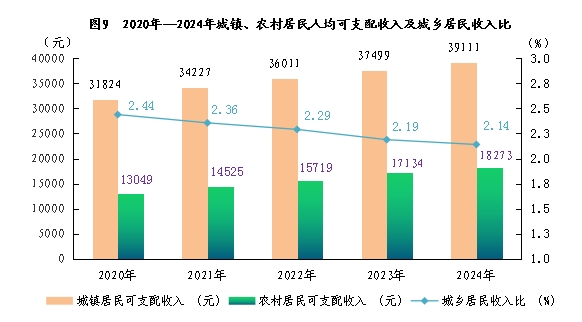 全年城鎮(zhèn)居民人均可支配收入39111元,比上年增長(zhǎng)4.3%;農(nóng)村居民人均可支配收入18273元,增長(zhǎng)6.6%。城鄉(xiāng)居民收入比值為2.14:1,比上年縮小0.05。