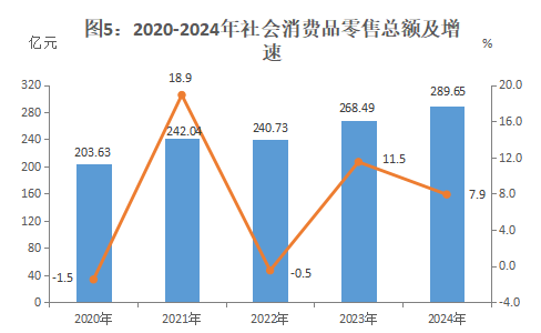 消費(fèi)品市場(chǎng)。2024年,全縣實(shí)現(xiàn)社會(huì)消費(fèi)品零售總額289.65億元,比上年增長(zhǎng)7.9%。按銷售地分:城鎮(zhèn)市場(chǎng)實(shí)現(xiàn)零售額145.83億元,增長(zhǎng)12.8%;鄉(xiāng)村市場(chǎng)實(shí)現(xiàn)零售額143.82億元,增長(zhǎng)3.3%。按消費(fèi)形態(tài)分:批發(fā)零售企業(yè)實(shí)現(xiàn)商品零售額217.88億元,增長(zhǎng)5.7%;住宿餐飲業(yè)實(shí)現(xiàn)餐費(fèi)收入71.77億元,增長(zhǎng)15.3%。