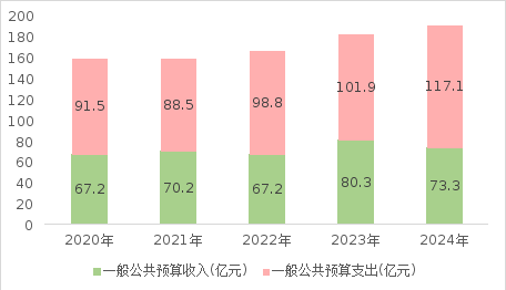 ????2024年,全區(qū)一般公共預(yù)算收入73.3 億元,比上年下降8.7%。區(qū)級稅收收入55.7億元,下降6.9%。其中,增值稅、企業(yè)所得稅、個人所得稅分別為19.1億元、9.4億元、3.0億元,分別占稅收比重34.3%、16.8%、5.5%。一般公共預(yù)算支出117.1億元,增長14.9%。2024年重慶市江北區(qū)人民政府國民經(jīng)濟和社會發(fā)展統(tǒng)計公報(2025年更新)