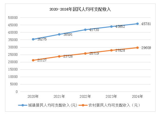 城鎮(zhèn)常住居民人均可支配收入45781元,比上年增長(zhǎng)4.4%;農(nóng)村常住居民人均可支配收入29609元,比上年增長(zhǎng)6.4%。城鄉(xiāng)居民人均可支配收入比為1.55。城鎮(zhèn)居民人均消費(fèi)性支出26351元,增長(zhǎng)3.8%;城鎮(zhèn)居民家庭恩格爾系數(shù)為30.0%。農(nóng)村居民人均生活消費(fèi)支出21212元,增長(zhǎng)1.4%;農(nóng)村居民家庭恩格爾系數(shù)為29.9%。