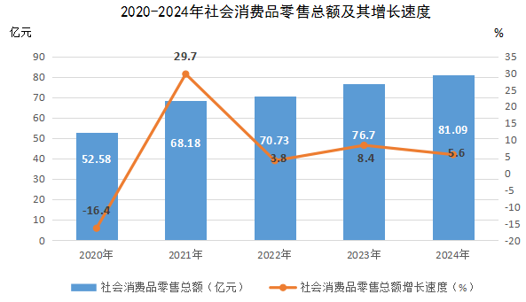 全年社會(huì)消費(fèi)品零售總額實(shí)現(xiàn)81.09億元,比上年增長(zhǎng)5.6%。其中限額以上企業(yè)實(shí)現(xiàn)零售額28.97億元。