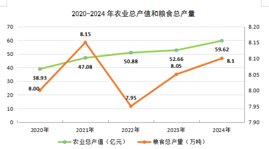 2024年全年實(shí)現(xiàn)農(nóng)林牧漁業(yè)總產(chǎn)值(現(xiàn)價(jià))59.62億元,按可比價(jià)格計(jì)算比上年增長(zhǎng)3.4%。