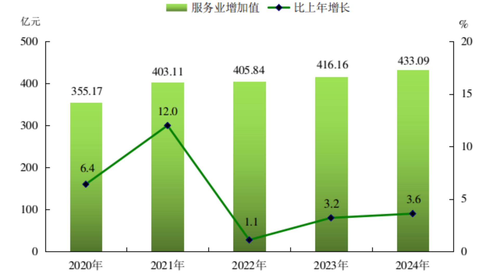圖7??2020-2024年賀州市服務(wù)業(yè)增加值及其增長速度
