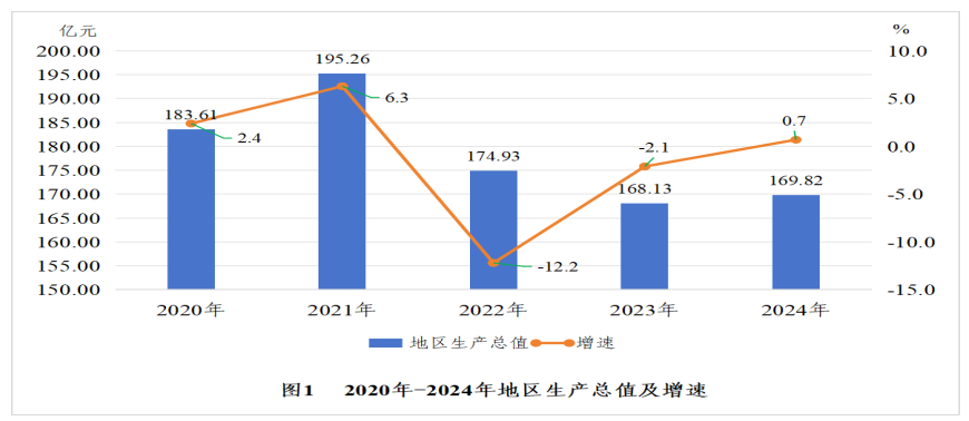 2024年,根據(jù)縣(市)生產(chǎn)總值統(tǒng)一核算結(jié)果,全縣地區(qū)生產(chǎn)總值完成169.82億元,比上年同期增長0.7%。按產(chǎn)業(yè)分,第一產(chǎn)業(yè)增加值完成17.28億元,比上年同期增長4.1%,占地區(qū)生產(chǎn)總值的比重為10.2%;第二產(chǎn)業(yè)增加值完成52.24億元,比上年同期下降5.3%,占地區(qū)生產(chǎn)總值的比重為30.8%;第三產(chǎn)業(yè)增加值完成100.31億元,比上年同期增長3.4%,占地區(qū)生產(chǎn)總值的比重為59.1%。人均地區(qū)生產(chǎn)總值71806元。