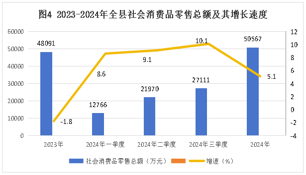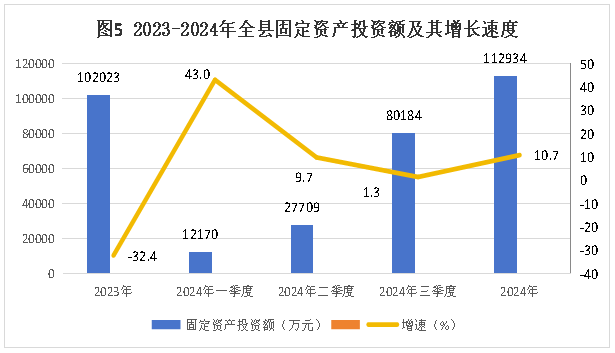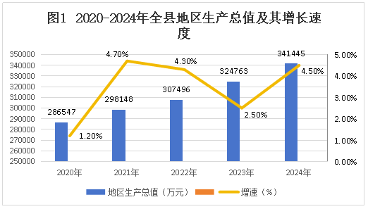 根據(jù)地區(qū)生產(chǎn)總值統(tǒng)一核算結(jié)果,2024年,全縣實(shí)現(xiàn)地區(qū)生產(chǎn)總值341445萬元,按不變價(jià)格計(jì)算,同比增長4.5%。其中:第一產(chǎn)業(yè)增加值55576萬元,同比增長3.2%,對(duì)GDP的貢獻(xiàn)率10.59%,拉動(dòng)GDP增長0.48個(gè)百分點(diǎn);第二產(chǎn)業(yè)增加值37538萬元,同比增長5.0%,對(duì)GDP的貢獻(xiàn)率12.19%,拉動(dòng)GDP增長0.55個(gè)百分點(diǎn);第三產(chǎn)業(yè)增加值248331萬元,同比增長4.7%,對(duì)GDP的貢獻(xiàn)率77.22%,拉動(dòng)GDP增長3.47個(gè)百分點(diǎn)。