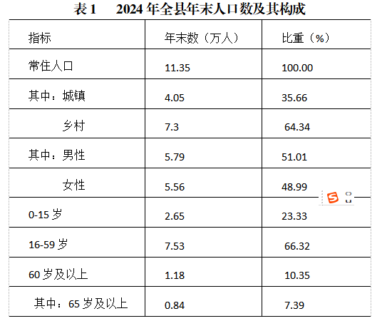 年末全縣總?cè)丝冢☉艏丝冢?33323人,比上年末增加186人。常住人口為11.35萬人,比上年末減少0.06萬人,其中,男性人口為5.79萬人,女性人口為5.56萬人,人口性別比為104.14(以女性為100)。全年出生人口為0.13萬人,人口出生率為11.65‰;死亡人口為0.11萬人,人口死亡率為9.77‰;人口自然增長率為1.88‰。0-15歲人口為2.65萬人,占全縣常住人口的比重為23.33%;16-59歲的勞動(dòng)年齡人口為7.53萬人,占全縣常住人口的比重為66.32%;60歲及以上人口為1.18萬人,占全縣常住人口的比重為10.35%,其中,65歲及以上人口為0.84萬人,占全縣常住人口的比重為7.39%。城鎮(zhèn)常住人口為4.05萬人,比上年末增加0.08萬人;鄉(xiāng)村常住人口為7.3萬人,減少0.14萬人;城鎮(zhèn)人口占全縣常住人口比重(城鎮(zhèn)化率)為35.66%,比上年末提高0.87個(gè)百分點(diǎn)。