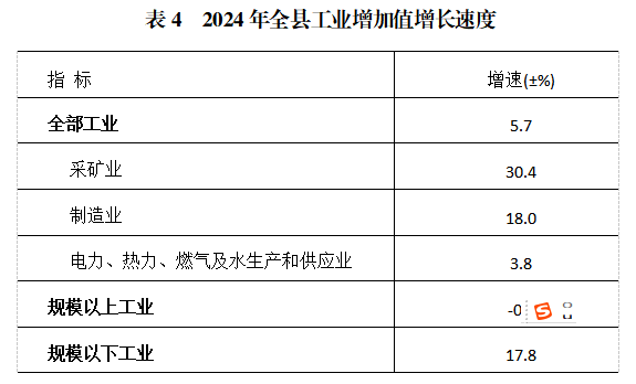 全年全部工業(yè)完成增加值25672萬元,同比增長5.7%。其中,規(guī)模以上工業(yè)增加值同比下降0.4%;規(guī)模以下工業(yè)增加值同比增長17.8%;分三大門類看,采礦業(yè)增長30.4%,制造業(yè)增長18.0%,電力、熱力、燃?xì)饧八a(chǎn)和供應(yīng)業(yè)增長3.8%。
