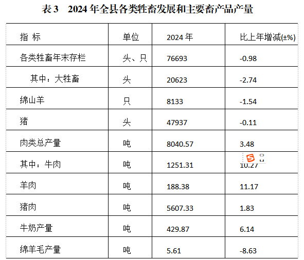 全年牛存欄1.66萬頭,同比下降2.84%,出售和自宰肉用牛1.08萬頭,同比增長9.0%;綿山羊存欄0.81萬只,同比下降1.54%,出售和自宰肉用羊1.18萬只,同比增長11.25%;豬存欄4.79萬頭,同比下降0.11%,出售和自宰肉用豬7.32萬頭,同比增長0.88%;年末雞存欄32.88萬只,同比下降4.13%,當(dāng)年出欄雞75.79萬只,同比增長2.85%。