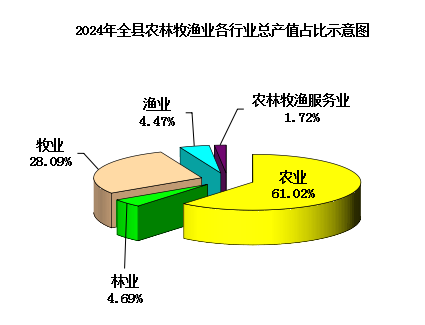 初步統(tǒng)計,2024年全縣農林牧漁業(yè)總產值1196226萬元,按可比價格計算,比上年增長3.4%。其中:農業(yè)產值729961萬元 ,增長2.5%;林業(yè)產值56110萬元,增長7.4%;牧業(yè)產值336038萬元 ,增長4.8%;漁業(yè)產值53528萬元?,增長2.8%;農林牧漁服務業(yè)產值20590萬元?,增長4.9%。