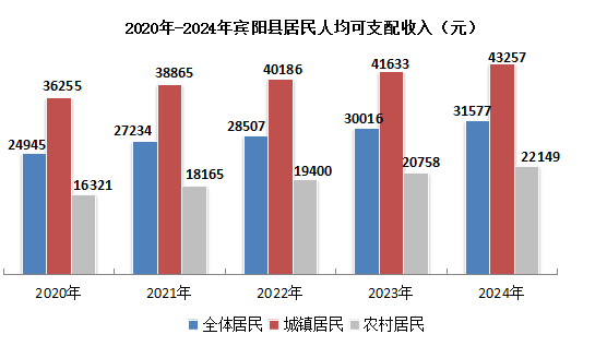 居民生活:2024年賓陽縣全體居民人均可支配收入31577元,比上年增收1561元,名義增長5.2%;城鎮(zhèn)居民人均可支配收入43257元,比上年增收1624元,名義增長3.9%;農村居民人均可支配收入22149元,比上年增收1391元,名義增長6.7%。