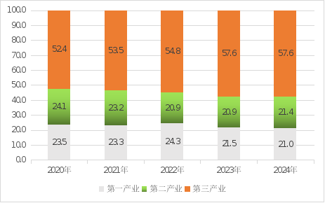 圖2 ?2020—2024年三次產(chǎn)業(yè)增加值占地區(qū)生產(chǎn)總值比重大牛工程師