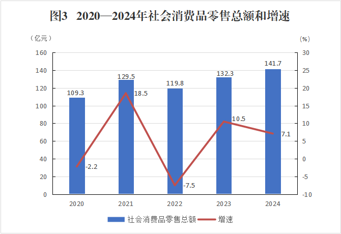 2024年,全社會消費品零售總額141.7億元,增長7.1%。按經(jīng)營地分,城鎮(zhèn)消費品零售額106.9億元,增長7.1%;鄉(xiāng)村消費品零售額34.8億元,增長7.2%。按行業(yè)分,批發(fā)業(yè)14.5億元,增長7.3%;零售業(yè)105.4億元,增長7.1%;住宿業(yè)1.2億元,增長7.0%;餐飲業(yè)20.6億元,增長7.2%。限額以上商貿(mào)企業(yè)全年通過互聯(lián)網(wǎng)實現(xiàn)的實物商品零售額0.5億元,下降5.1%。