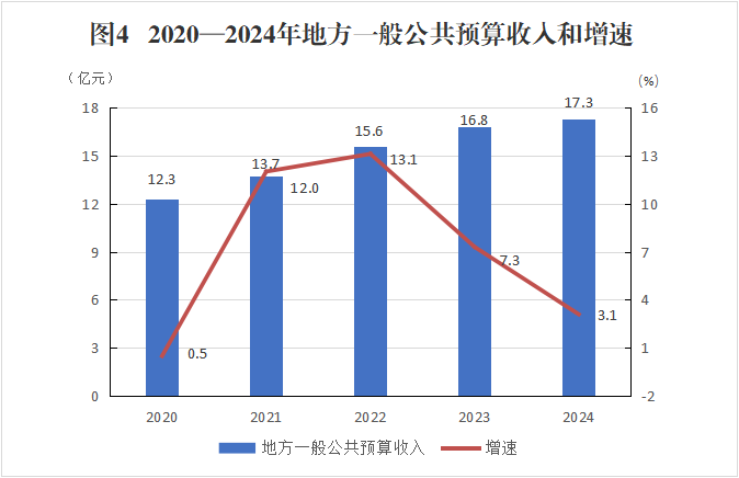 全年實現(xiàn)地方公共財政收入17.3億元,增長3.1%。其中,稅收收入6.9億元,下降7.8%;非稅收入10.3億元,增長12.0%。地方公共財政支出60.6億元,增長11.5%。