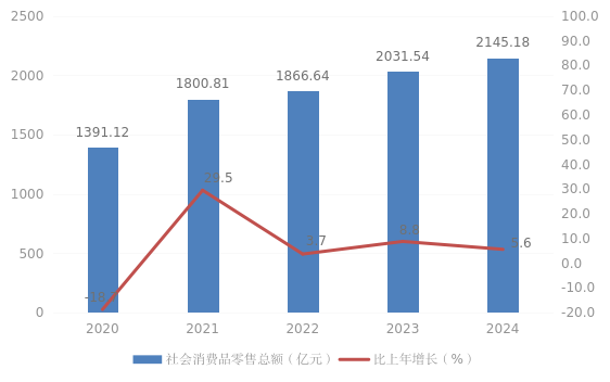 圖4 2020-2024年全市社會(huì)消費(fèi)品零售總額及其增速
