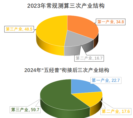 2024年全區(qū)實現(xiàn)地區(qū)生產(chǎn)總值[1]142.2億元(第五次全國經(jīng)濟普查銜接),比上年增長2.7%。其中,第一產(chǎn)業(yè)實現(xiàn)增加值32.2億元,比上年下降0.1%;第二產(chǎn)業(yè)實現(xiàn)增加值25.1億元,比上年增長5.2%;第三產(chǎn)業(yè)實現(xiàn)增加值84.9億元,比上年增長3.5%。“五經(jīng)普”銜接后產(chǎn)業(yè)結(jié)構(gòu)發(fā)生較大變化,三次產(chǎn)業(yè)結(jié)構(gòu)由上年的從34.8:16.7:48.5調(diào)整為22.7:17.6:59.7。