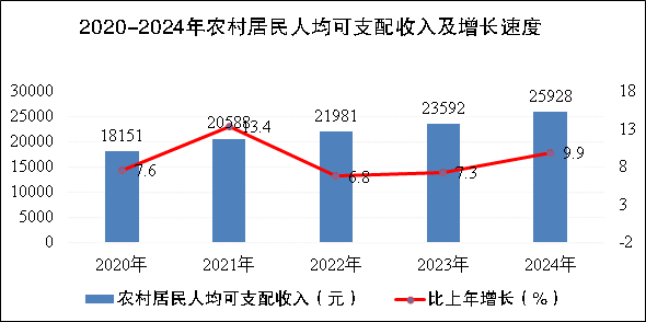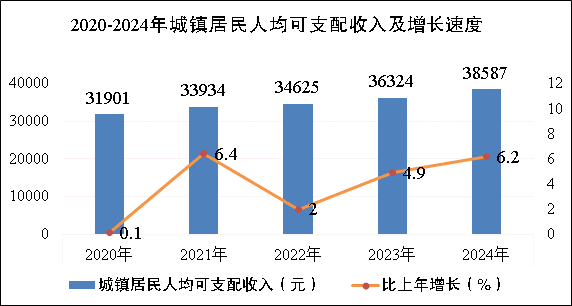 2024年居民人均可支配收入32646元,同比增長7.8%。按常住地分,城鎮(zhèn)居民人均可支配收入38587元,同比增長6.2%;農(nóng)村居民人均可支配收入25928元,同比增長9.9%。