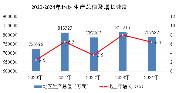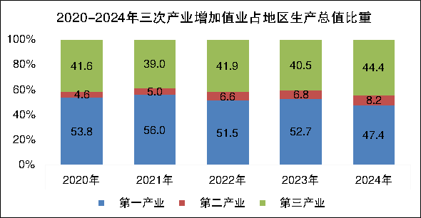 初步核算,初步核算,2024年實(shí)現(xiàn)地區(qū)生產(chǎn)總值(GDP)789587萬元,同比增長6.4%。其中第一產(chǎn)業(yè)增加值373998萬元,同比增長6.9%,對GDP的貢獻(xiàn)率為61%,拉動(dòng)GDP增長3.9個(gè)百分點(diǎn);第二產(chǎn)業(yè)增加值64758萬元,同比增長25.6%,對GDP的貢獻(xiàn)率為24.4%,拉動(dòng)GDP增長1.6個(gè)百分點(diǎn);第三產(chǎn)業(yè)增加值350830萬元,同比增長2.5%,對GDP的貢獻(xiàn)率為14.6%拉動(dòng)GDP增長0.9個(gè)百分點(diǎn)。三次產(chǎn)業(yè)比由上年的52.7:6.8:40.5調(diào)整為47.4:8.2:44.4。分季度看,一季度地區(qū)生產(chǎn)總值同比增長6.3%,上半年增長6.0%,前三季度增長5.3%,四季度增長6.4%。