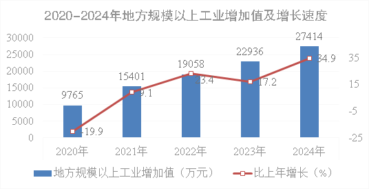 實(shí)現(xiàn)規(guī)模以上工業(yè)增加值27414萬元,同比增長34.9%。分門類看,采礦業(yè)實(shí)現(xiàn)增加值4922萬元,同比增長152.2%;制造業(yè)實(shí)現(xiàn)增加值17742萬元,同比增長26.1%;電力、熱力、燃?xì)鈽I(yè)實(shí)現(xiàn)增加值4750萬元,同比增長9.3%。