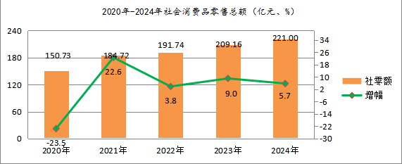 2024年,全區(qū)實(shí)現(xiàn)社會消費(fèi)品零售總額221.00億元,同比增長5.7%。其中,限額以上單位零售額194.98億元,同比增長13.9%。
