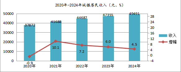 2024年,全區(qū)城鎮(zhèn)常住居民人均可支配收入49491元,同比增長4.5%。全區(qū)農(nóng)村常住居民人均可支配收入27908元,同比增長6.6%。