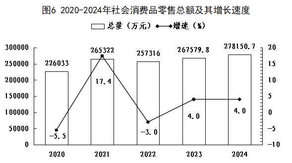 全年全縣社會消費(fèi)品零售總額278150.7萬元,增長4.0%。按經(jīng)營地統(tǒng)計,城鎮(zhèn)消費(fèi)品零售額161080萬元,增長3.8%;鄉(xiāng)村消費(fèi)品零售額117070.7萬元,增長4.2%。按消費(fèi)形態(tài)統(tǒng)計,商品零售額271057.2萬元,增長3.9%;住宿和餐飲業(yè)餐飲收入7093.5萬元,增長6.2%。