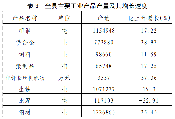 從門類看:全年全縣采礦業(yè)增加值5741萬元,增長30%;制造業(yè)增加值266588萬元,增長4.27%;電力、熱力、燃?xì)饧八a(chǎn)和供應(yīng)業(yè)7548萬元,增長13.42%。