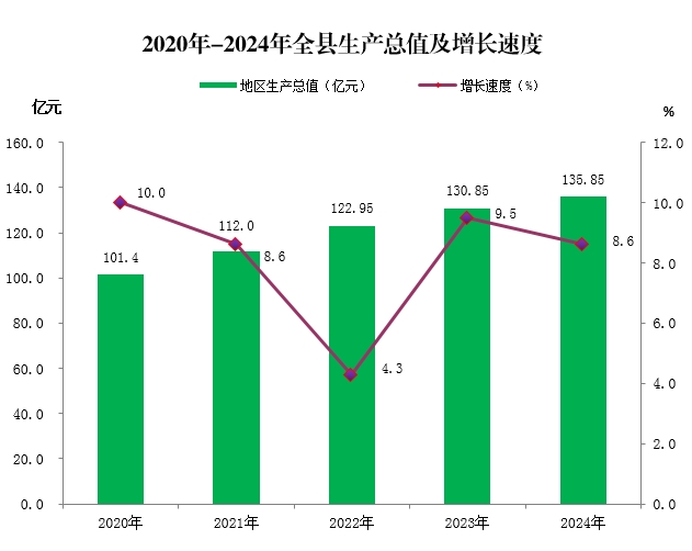初步核算,全年全縣實(shí)現(xiàn)生產(chǎn)總值1358510萬元,按不變價(jià)格計(jì)算,比上年增長8.6%。其中,第一產(chǎn)業(yè)增加值250809萬元,增長4.4%;第二產(chǎn)業(yè)增加值429429萬元,增長22.4%;第三產(chǎn)業(yè)增加值678272萬元,增長1.9%。按常住人口計(jì)算,人均地區(qū)生產(chǎn)總值40981元,比上年增長7.4%。三次產(chǎn)業(yè)結(jié)構(gòu)為18:32:50。