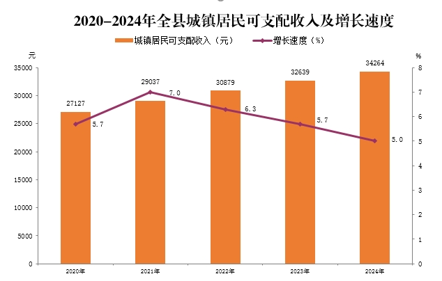 全年城鎮(zhèn)居民人均可支配收入34264元,比上年增長5%。其中,工資性收入19542元,比上年增長5.2%;經(jīng)營凈收入9898元,比上年增長4.9%;轉(zhuǎn)移凈收入3505元,比上年增長3.4%;財(cái)產(chǎn)凈收入1319元,比上年增長6.8%。人均消費(fèi)性支出19033元,比上年增長4.9%。城鎮(zhèn)居民恩格爾系數(shù)為24.8%。