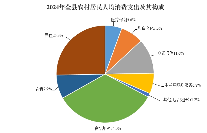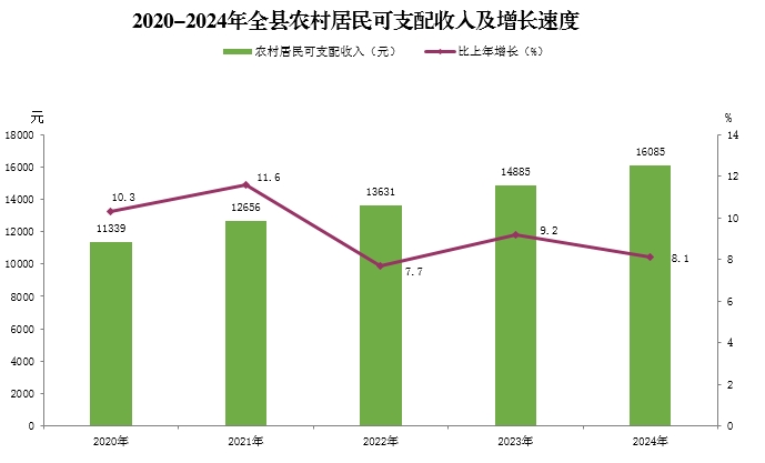 2024年農(nóng)村居民人均可支配收入16085元,比上年增長8.1%。其中,工資性收入6286元,比上年增長4.9%;經(jīng)營凈收入6057元,比上年增長5.8%;轉(zhuǎn)移凈收入3297元,比上年增長4.9%;財(cái)產(chǎn)凈收入445元,比上年增長20倍。農(nóng)村人均消費(fèi)性支出10633元,比上年增長8.7%。農(nóng)村居民恩格爾系數(shù)為34.0%。