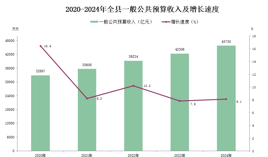 全年一般公共預(yù)算收入45730萬元,比上年增長8.1%。其中,稅收收入32897萬元,比上年增長7.0%。