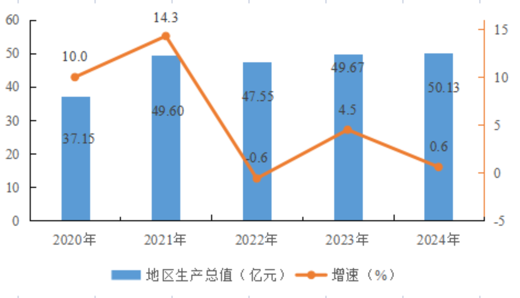 初步核算,2024年合山市生產(chǎn)總值(GDP)50.13億元,按可比價計算,比上年增長0.6%。其中:第一產(chǎn)業(yè)增加值7.48億元,增長4.9%;第二產(chǎn)業(yè)增加值20.70億元,下降6.1%;第三4.0產(chǎn)業(yè)增加值21.95億元,增長5.7%。第一、二、三產(chǎn)業(yè)增加值占地區(qū)生產(chǎn)總值的比重分別為14.9%、41.3%、43.8%,對經(jīng)濟(jì)增長的貢獻(xiàn)率分別為112.3%、-451.2%、438.9%。按常住人口計算,全年人均地區(qū)生產(chǎn)總值53241元,比上年增長3.7%。
