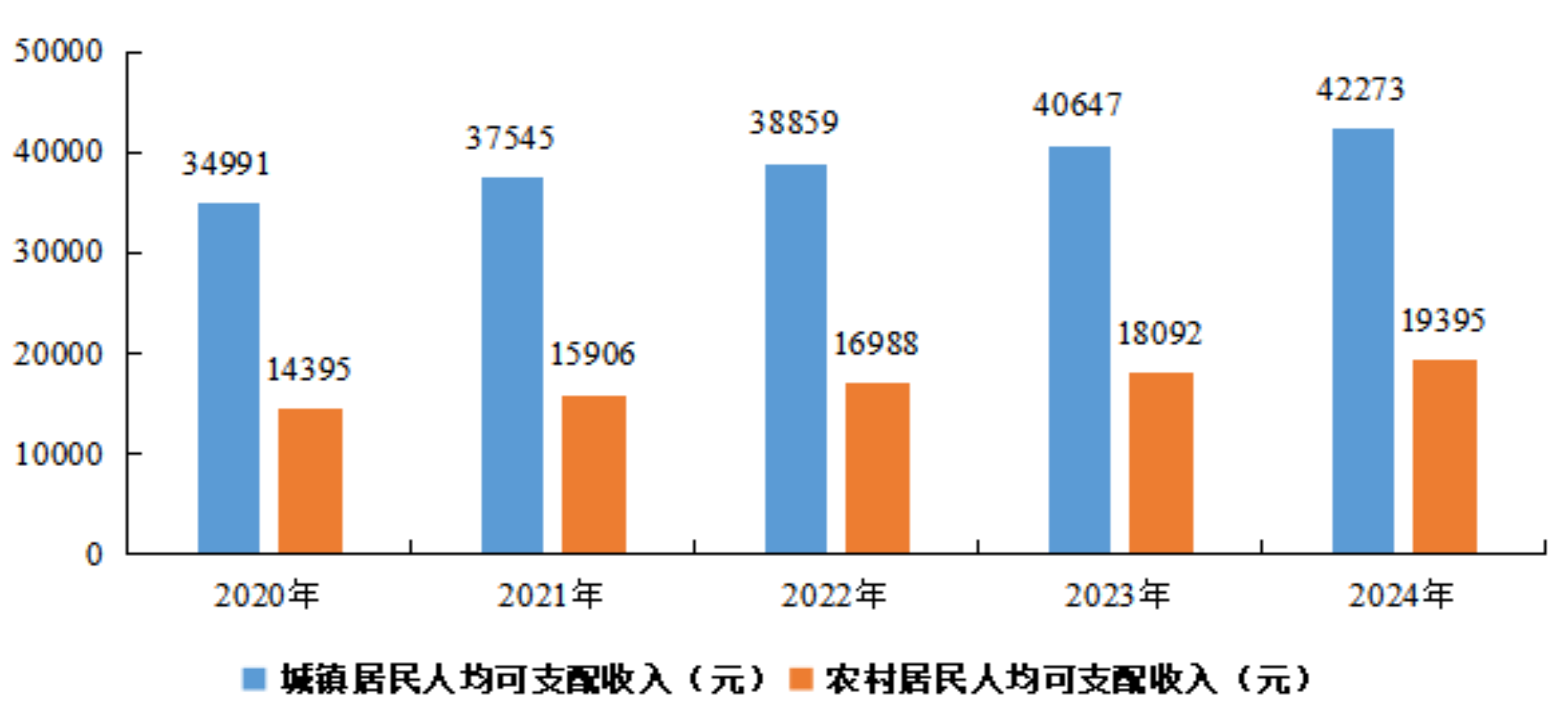 全年全市居民人均可支配收入34471元,比上年名義增長4.7%。按常住地分,城鎮(zhèn)居民人均可支配收入42273元,比上年名義增長4.0%;農(nóng)村居民人均可支配收入19395元,比上年名義增長7.2%。