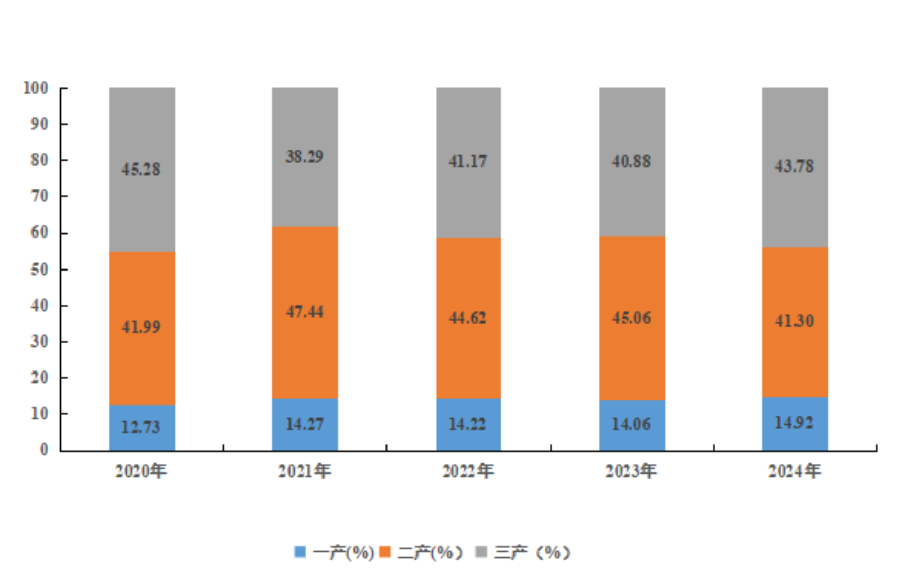 圖2? 2020—2024年合山市三次產(chǎn)業(yè)增加值占GDP比重