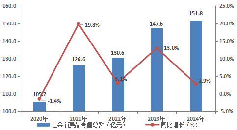 圖6 2020—2024年全市社會(huì)消費(fèi)品零售總額及增速