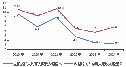 圖9 2019—2024年城鎮(zhèn)居民、農(nóng)村居民人均可支配收入增速