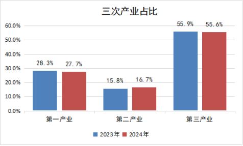 第一產(chǎn)業(yè)、第二產(chǎn)業(yè)和第三產(chǎn)業(yè)增加值占生產(chǎn)總值的比重分別為27.7%、16.7%和55.6%。2024年黔東南苗族侗族自治州從江縣人民政府國民經(jīng)濟(jì)和社會發(fā)展統(tǒng)計(jì)公報(bào)(2025年更新)