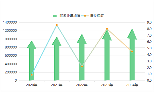 圖6:2020-2024年服務(wù)業(yè)增加值及其增長(zhǎng)速度 單位:萬元、%