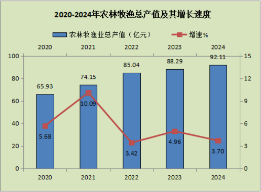 2024年,全縣農(nóng)林牧漁業(yè)總產(chǎn)值92.11億元,增長3.7%。其中:農(nóng)業(yè)產(chǎn)值49.19億元,增長3.5%;林業(yè)產(chǎn)值11.04億元,增長6.1%;牧業(yè)產(chǎn)值26.64億元,增長2.9%;漁業(yè)產(chǎn)值1.24億元,增長3.4%。糧食產(chǎn)量增長0.3%;糖料蔗產(chǎn)量下降13.3%;蔬菜產(chǎn)量增長4.7%;水果產(chǎn)量增長6.6%;肉類總產(chǎn)量下降3.9%,其中豬肉產(chǎn)量下降4.0%,禽肉產(chǎn)量下降3.6%;鮮蠶產(chǎn)量增長7.1%,禽蛋產(chǎn)量增長4.8%;水產(chǎn)品產(chǎn)量增長2.7%;生豬出欄數(shù)下降4.4%;家禽出欄數(shù)下降4.9%。