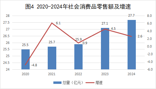 ? ??全年社會消費(fèi)品零售總額實(shí)現(xiàn)27.7億元,比上年增長2.6%。按經(jīng)營單位所在地分,城鎮(zhèn)消費(fèi)品零售額實(shí)現(xiàn)17.1億元,同比增長2.7%;鄉(xiāng)村消費(fèi)品零售額實(shí)現(xiàn)10.6億元,同比增長2.4%。