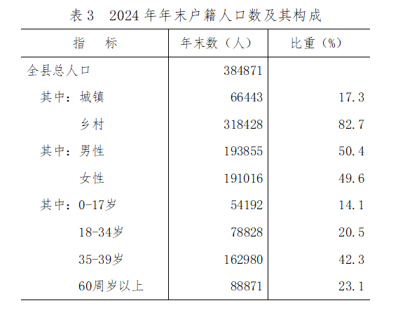 ? ? 2024年全縣人口出生率為5.04‰,死亡率為7.92‰。年末全縣戶籍人口為384871人,其中,男性人口為193855人,女性人口為191016人。少數(shù)民族人口為76996人,占總?cè)丝诘?0%。