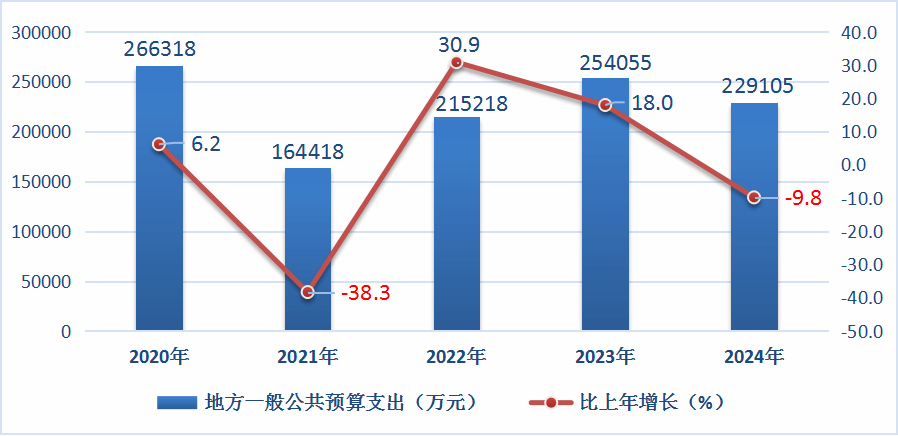 地方一般公共預(yù)算支出完成229105萬元,比上年下降9.8%。其中,一般公共服務(wù)支出16831萬元,下降13.8%;教育支出45517萬元,增長2.6%;社會保障和就業(yè)支出37784萬元,下降6.7%;衛(wèi)生健康支出18517萬元,增長7.3%;農(nóng)林水支出45822萬元,下降26.4%;交通運輸支出9596萬元,下降14.7%;住房保障支出8382萬元,下降28.8%。